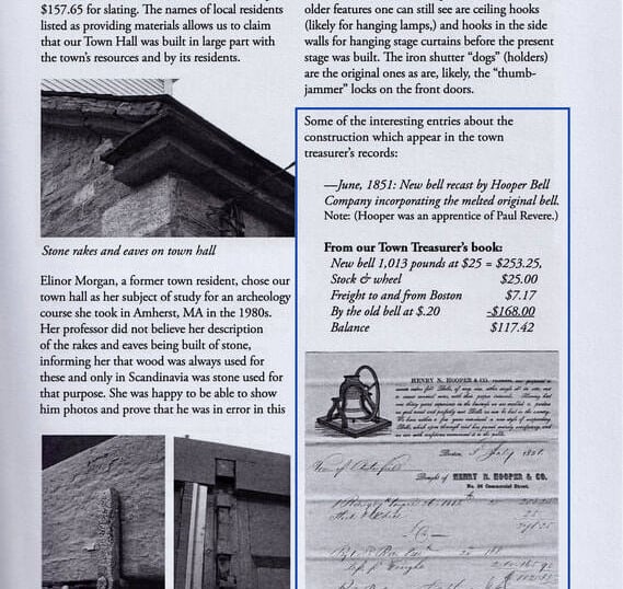 In June 1851, as the new town hall was being quickly reconstructed of stone, records indicate that the original bell was incorporated into a new bell recast by the Hooper Bell Company of Boston (Hooper apparently was an apprentice of Paul Revere earlier). I’ve included a photo of the Hooper bell, which certainly bears a resemblance to known Revere bells.