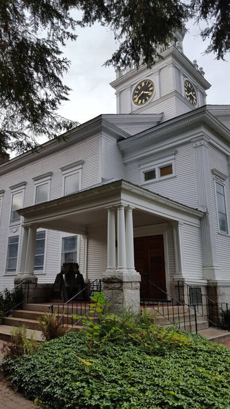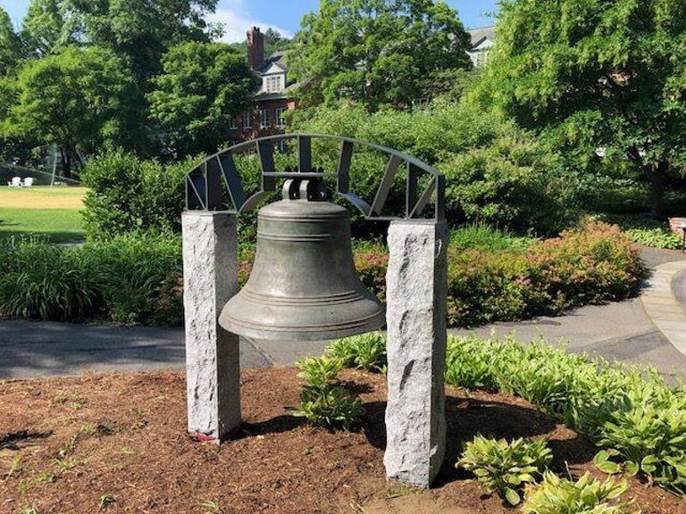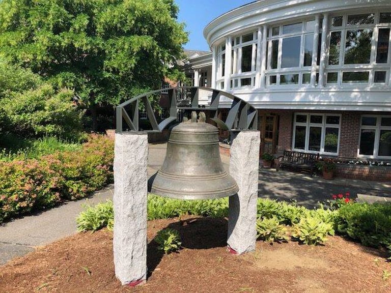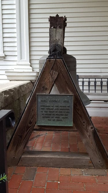The Unitarian church displays the Revere bell on the porch for easy access